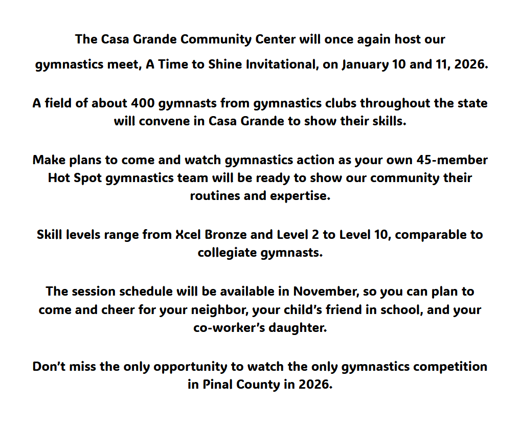 Serving the community since 2012, Hot Spot Gymnastics is honored to be the largest and most trusted gymnastics program in Pinal County. We invite you to join our growing community and experience the difference in quality, care, and commitment.